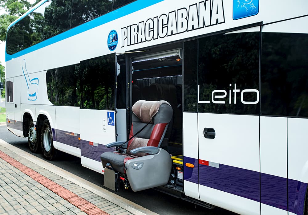 ÔNIBUS DE DOIS ANDARES, dispõe de 01 poltrona acessível no piso inferior junto a Cabine do Motorista.